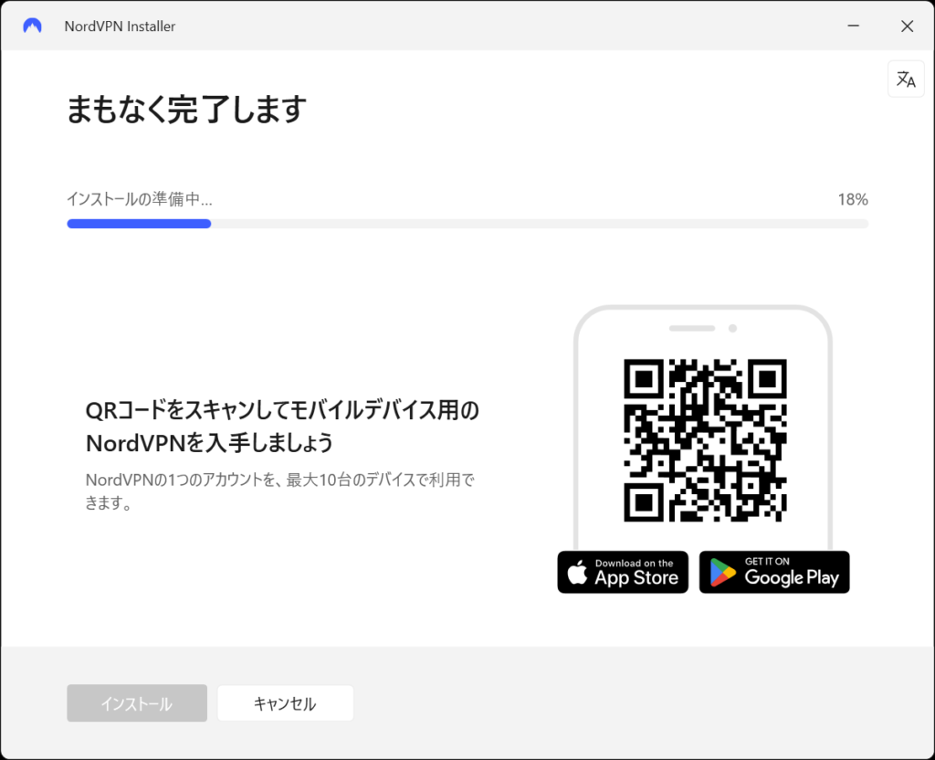 インストール中にスマホ用(iPhone/Android)のアプリをダウンロードできるQRコードも出てきます。
