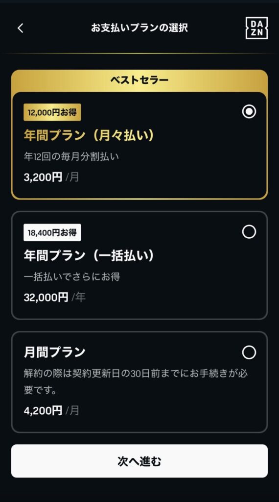 Jリーグやプロ野球など、DAZNの提供するすべてのコンテンツを見れる「スタンダードプラン」を選択しましょう。