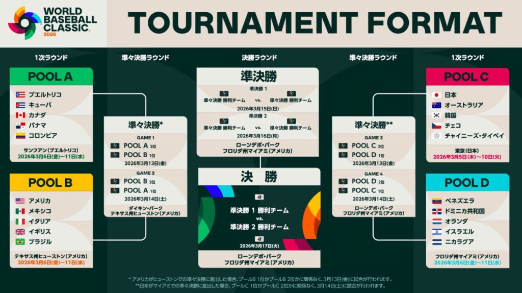 2026年のWBC1次リーグは4つのプールで総当り戦を行い、上位2チームが準々決勝ラウンドに進出します。
